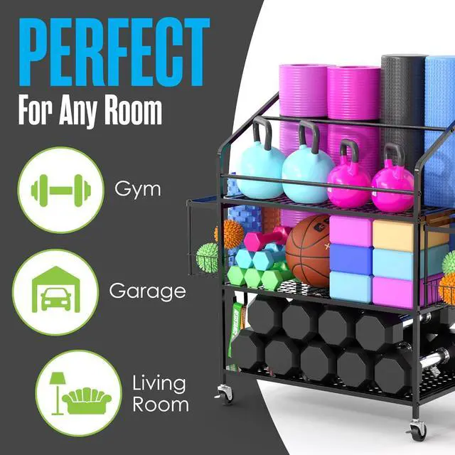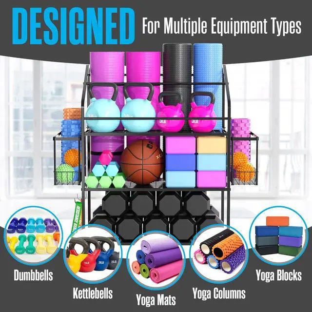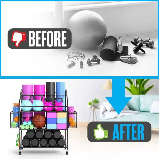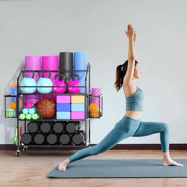 ORGANIZE IT ALL: Keep all your fitness equipment neatly organized in one convenient location! This gym equipment storage is perfect for those who have a well-equipped and diverse home workout gym. With its versatile design, it can accommodate a variety of equipment, including dumbbells, kettlebells, yoga mats, columns, blocks, bands, and more.