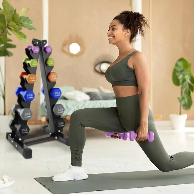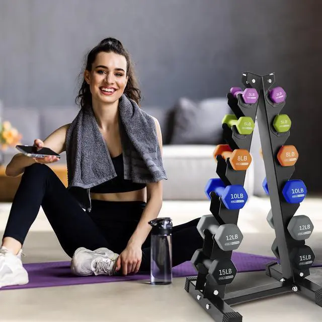 Complete Fitness Starter Kit: This set includes 3, 5, 8, 10, 12, and 15-pound dumbbells paired with a compact storage rack, giving you a well-rounded selection of weights for a variety of workouts while keeping everything organized.