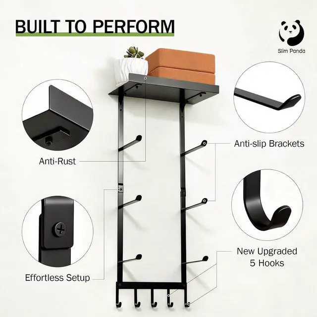 Metal Floating Shelf & 5 Hooks: Our yoga mat holder wall mount features a high-load metal floating shelfsuperior to fragile wooden onesperfect for storing yoga blocks, towels, or even small plants. 5 hooks for resistance bands, yoga straps, jump ropes, and gym bags, making this yoga mat wall holder a true central hub for your fitness gear.