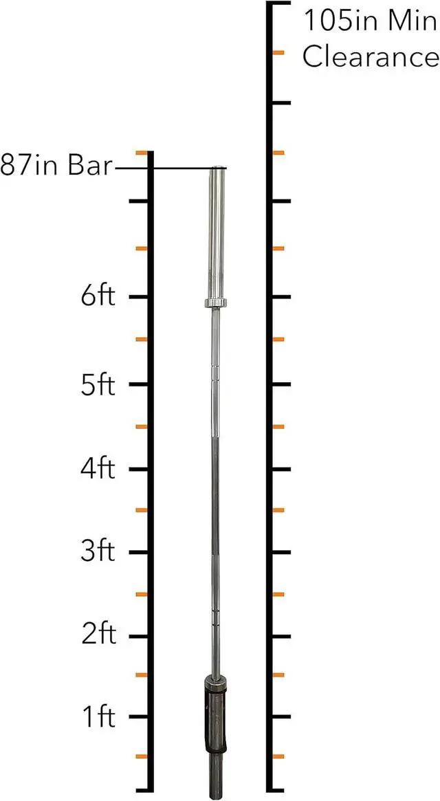 VERSATILE FIT: Designed to accomodae both Olympic and Standard bars, our Barbell Storage Rack plays by the rules, requiring a 105" ceiling for Men' s 87" bars and a 93" ceiling for Women' s 79" bars. It' s not just about storage; it' s about making your space fit for every lift, lunge, and squat.