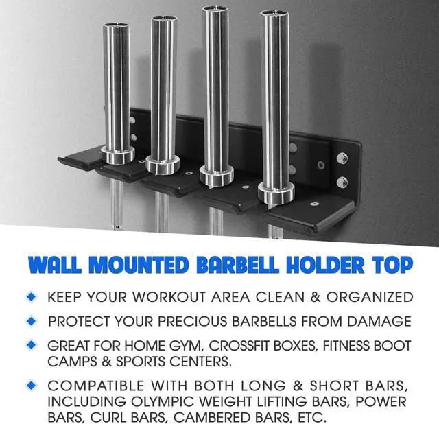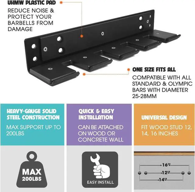 Heavy capacity load: strong construction can withstand up to 200 pounds. Just simply secure it in place, you can store both long & short bars, including Olympic weightlifting bars, power bars, curl bars, cambered bars, and more
