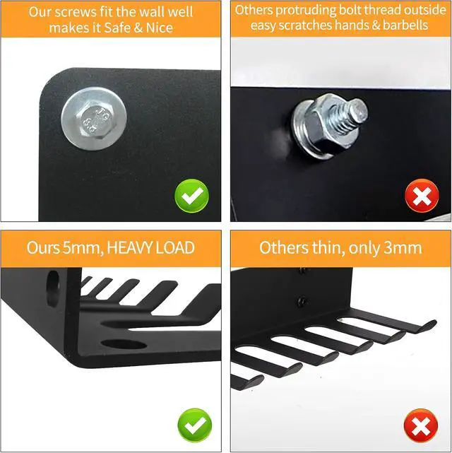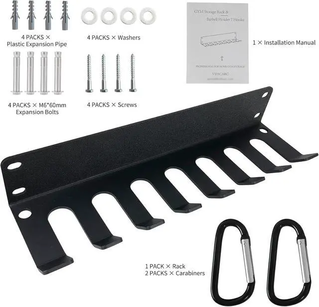 EXTRA WIDER HOOK INCREASES STORAGE CAPACITY: The gym rack organizer comes with wall mounting hardware, including (4) 1.5 -inch screws, (4) washers, (2) masonry anchors, and an installation manual. The extra wider hook make the whole max holding weight 45kg/100lb for drywall and 68kg/150lb for the concrete wall.