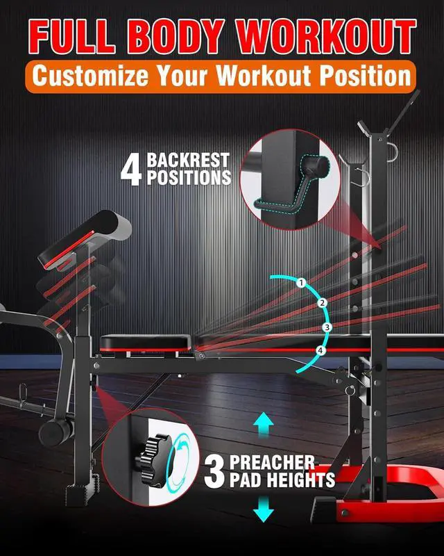 Quick Adjustments, Enjoy FitnessThe backrest of this weight bench offers 4 adjustable angles, allowing you to tailor it to different exercises and comfort levels. The preacher pad of this weight bench has 3 adjustable heights, helping you find the best support for various curls, enhancing workout effectiveness