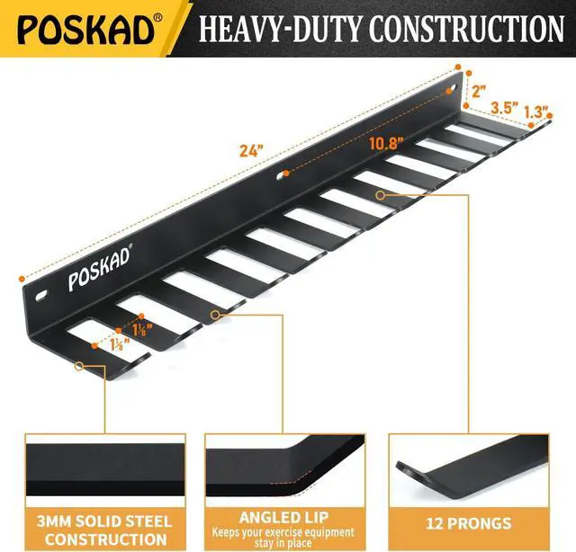 Versatile Storage Rack: The gym storage rack allows you to hold multiple gym items (Barbells and weight vests, resistance bands, tricep pulldown, cable attachments, ankle weights, lat pull-down bar, power belts, gym bags, massage rollers, yoga mats, yoga straps, jump ropes, etc. ), effectively freeing up your space. Please note that this rack is not suitable for barbells with handles diameter greater than 1 1/8" wide as this is the gap between the hooks.