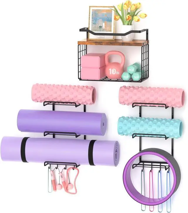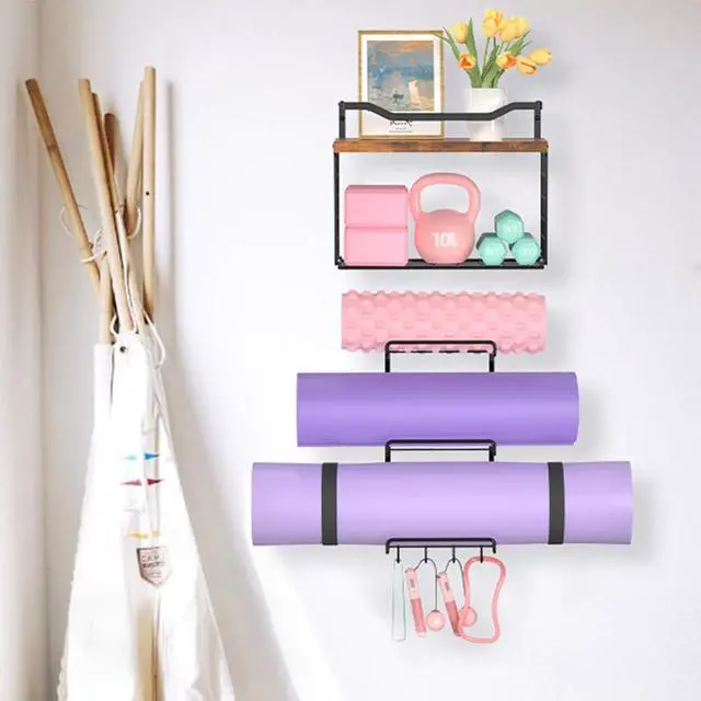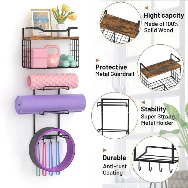Home Gym Organizer: The yoga mat holder wall mount storage home gym accessories with 6-Tiers yoga mat holder, wood floating shelves, storage basket and 8 hooks, can store your yoga mats, foam rollers, exercise bands very well and more, maximizing your storage space.