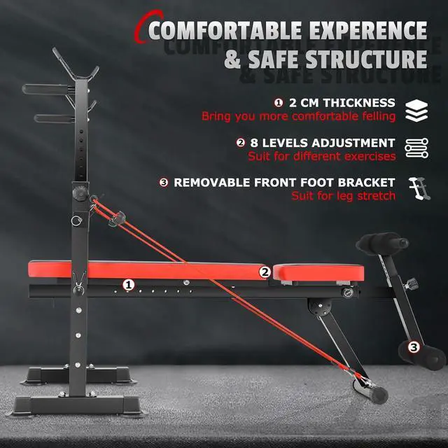 Adjustable Weight Bench RackThis weight lifting bench has 8 adjustable backrest positions and 9 adjustalbe barbell rack positions. Backrest adjusts for flat/incline positions, which can satisfy your different exercise demands and cater to people of different build. Height adjustable and folded design brings more convenience to your exercising.
