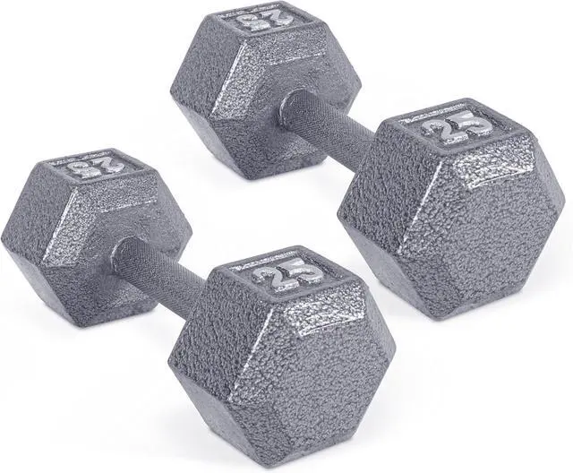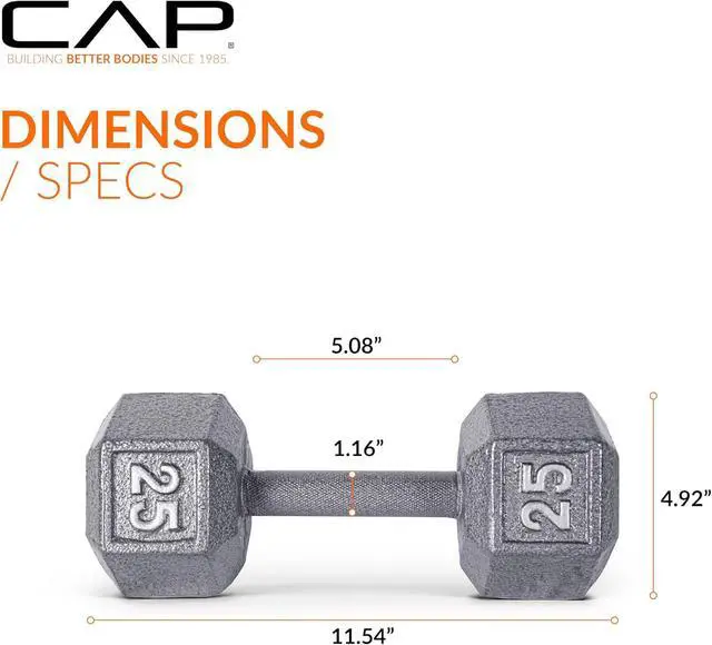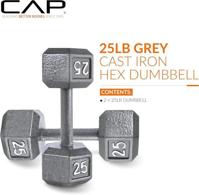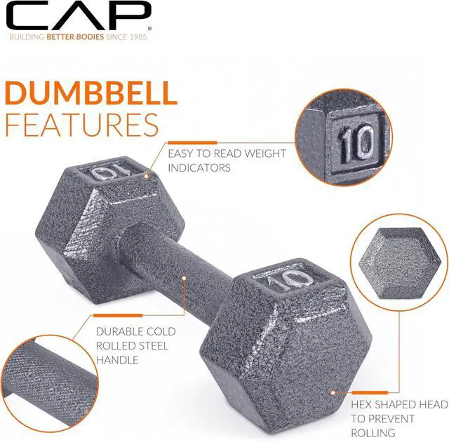 CHOICES This cast iron dumbbell group from CAP is available in sizes from 3, 5, 8, 10, 12, 15 - 120 lb in 5 lb increments.