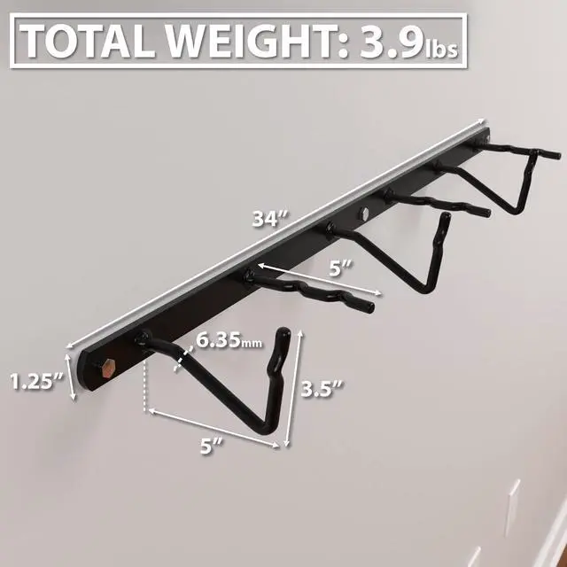 6 STORAGE POSTS - This Rack has 6 black powder-coated storage pegs, each 6.35 mm in diameter. They designed and spaced to keep your gear away from your walls to avoid dings and damage, and to accommodate universal attachment point on standard Cable Attachment Handles.