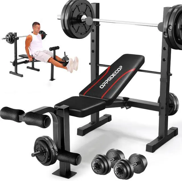 9 in 1 Bench PressThis OPPSDECOR all-in-one weight bench includes an adjustable weight bench, a heavy-duty barbell rack and a dual-function leg developer, allowing you to do lever bench press, one-arm dumbbell row, dumbbell press, leg curl & extension, sit-ups and more. (It' s worth mentioning that weights and barbells are not included. )