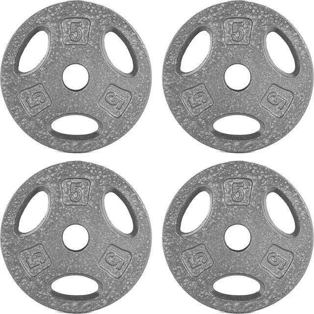 SET OF 4 (each 5 lbs., TOTAL of 20 lbs. ) - Made of solid cast iron and coated in a gray baked enamel finish to prevent chipping and peeling; Ground edges and machine center hole ensure a standardized product; Standard plates have a 1 inch center hole to accommodate standard bars