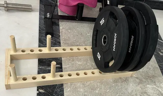 QUICK PLATE ACCESS Easily roll or lift your plates into the wooden rack during workouts. Save time, stay focused, and switch weights faster without interrupting your training flow.