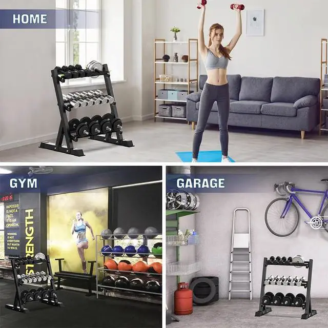 STORE ALL DUMBBELL SIZES - The tiers adjust to 2 widths to neatly fit varying dumbbell sizes. Keep your home gym organized with convenient storage.