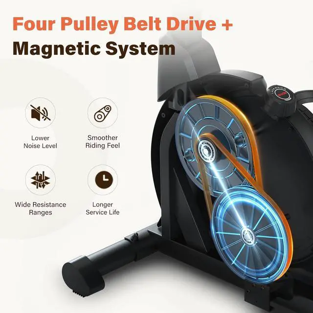 Four Pulley Magnetic SystemThe SNODE RB10 Recumbent Bike features a quiet and smooth ride thanks to its advanced magnetic resistance system. The magnetic resistance provides a smooth and consistent workout experience, eliminating the noise and vibrations associated with traditional exercise bikes. The bike is also equipped with wheels for easy transportation and storage.