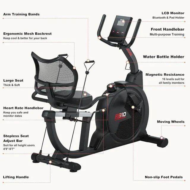 Recumbent Bike for Home Enjoy a comfortable and effective workout with our SNODE RB10 Recumbent Bike. With 16 levels of magnetic resistance, you can customize your exercise intensity to suit your fitness level. The LCD monitor tracks your workout progress, including time, distance, speed, and calories burned, providing you with the motivation you need to reach your goals.