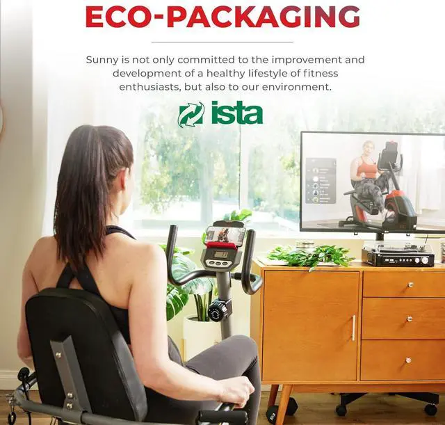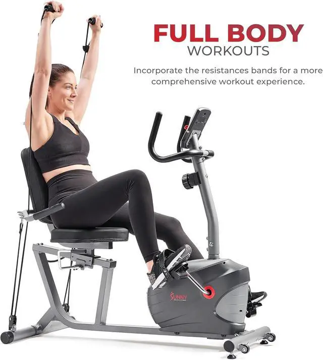 SMART RECUMBENT BIKE + ARM EXERCISERSync with the SUNNYFIT app and enjoy full-body training with the included resistance bands, while benefiting from the quiet magnetic resistance. Track your progress on the digital monitor with pulse sensors, all while staying comfortable on the extra-wide, padded seat.