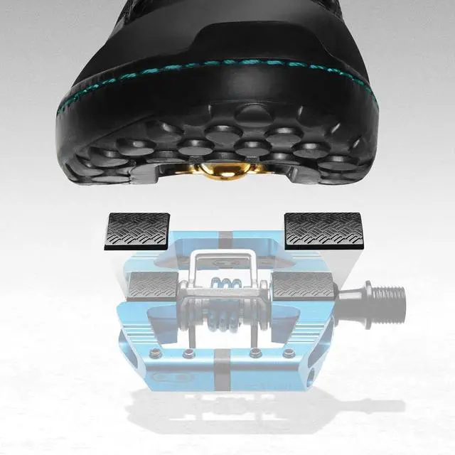 PEDAL INTERFACE: 4-sided entry for superior mud shedding, integrated traction pad technology to optimize the shoe/pedal interface, customizable float & release angle (premium brass cleats with shims included)