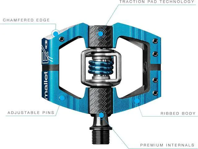SUPERIOR STABILITY AND PERFORMANCE: Concave platform for secure foothold, 6 adjustable pins per side for traction, chamfered edges to reduce rock-strikes, ribbed body for better traction when unclipped, 52mm q-factor for maneuverability on tight trails