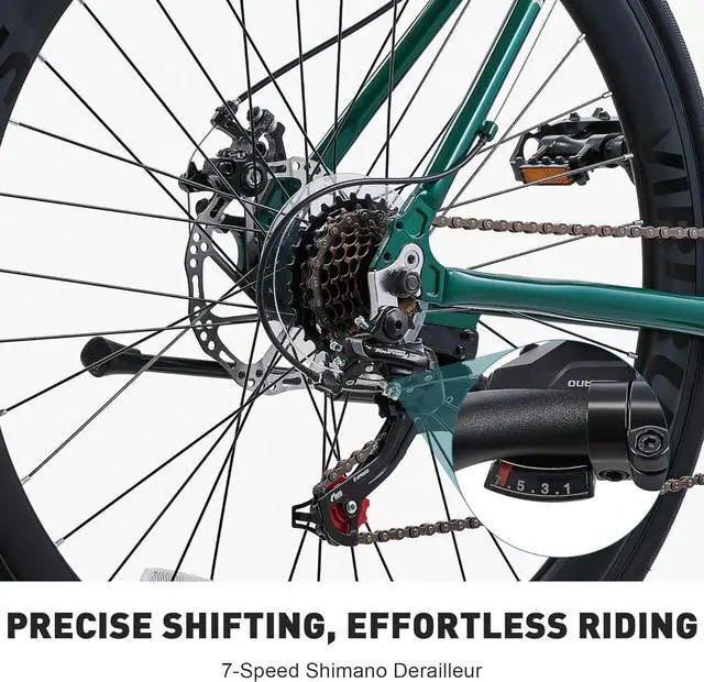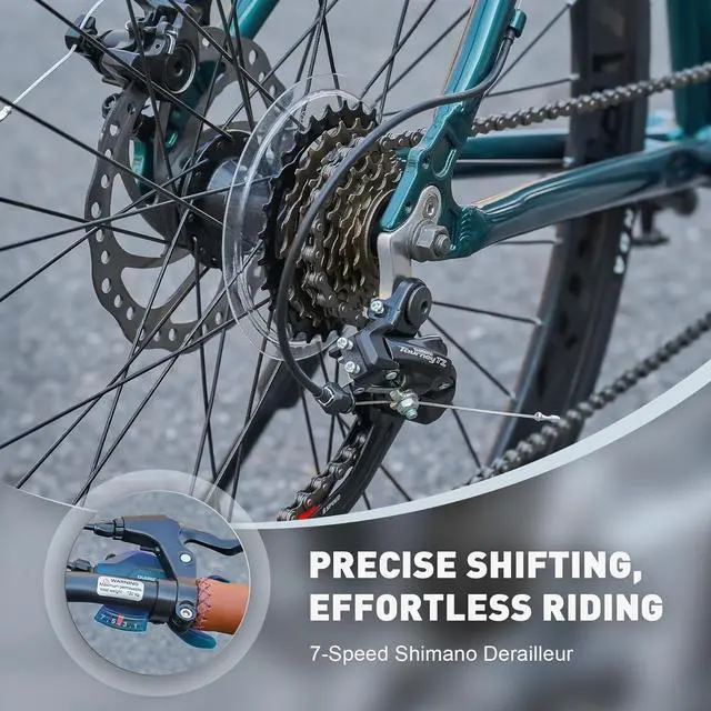 Smooth Shifting: Our men' s hybrid bike boasts a 7-speed derailleur that provides smooth and accurate gear changes through an easy thumb shifter, ensuring seamless and stable riding experiences