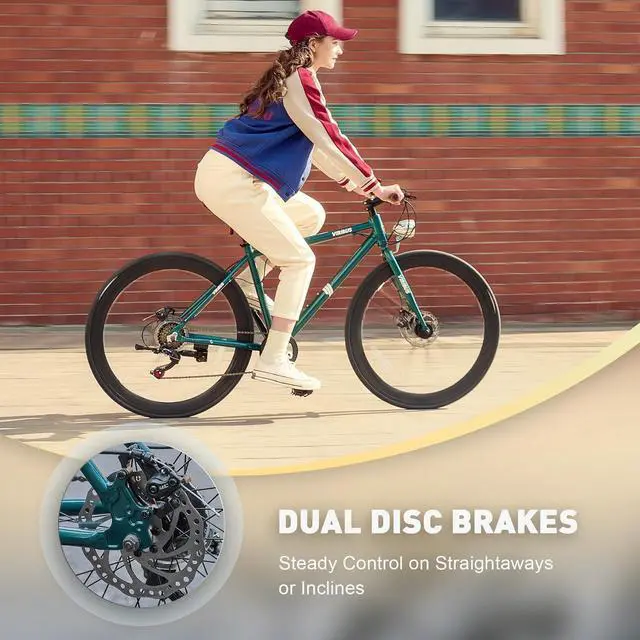 Safe Braking: Our hybrid bike comes with dual disc brakes that work great even when you' re cruising at high speeds. The aluminum alloy brake pads are tough and built to last, giving you solid stopping power in any weather during your rides