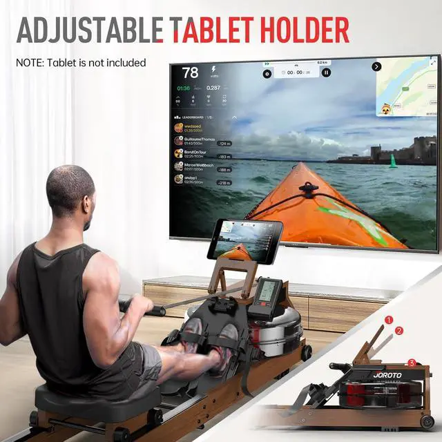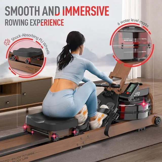 Smooth & Realistic Rowing ExperienceJOROTO water rowing machine features an advanced water resistance system that dynamically adjusts with water level and rowing speed, delivering a soothing water sound for a truly realistic rowing experience. Its ergonomic seated row machine design ensures a comfortable glide, creating an immersive rowing workout at home.