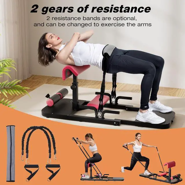 MULTIFUNCTIONAL DESIGN - Sissy squat machine home offers 5 adjustable height levels, easy to find comfortable position; Comes with two 30 lbs resistance bands and padded covers to enhance workout intensity; Unlock various exercises such as Deep sissy squat, band squat, forward lunge, push-up and even more.