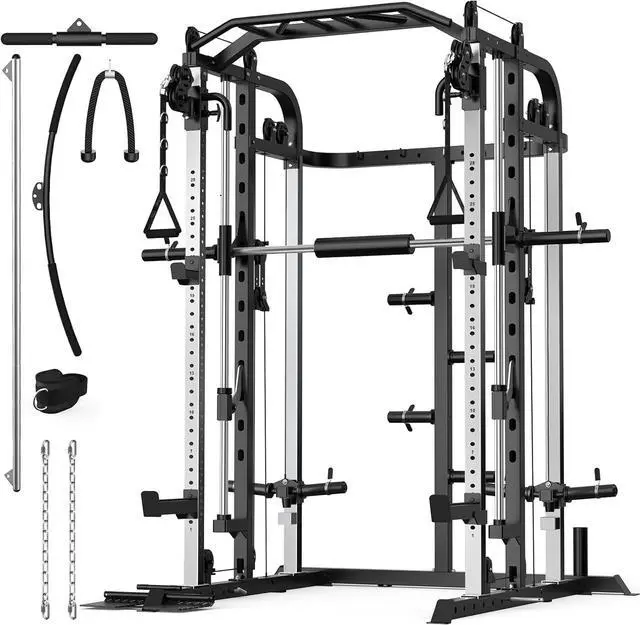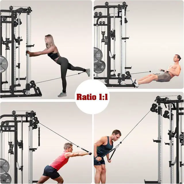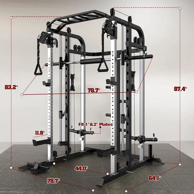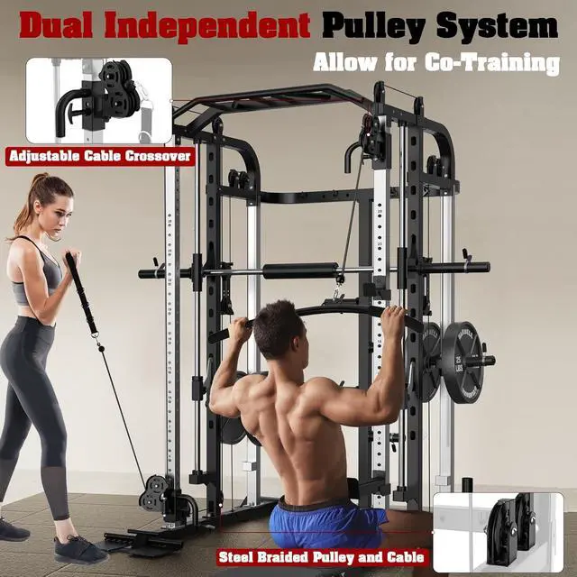 All in One: Unlike other machine, this home gym system combines a smith machine, power cage, cable crossover system in one. The versatile ultimate training station for home fitness, provides you with everything you need for a full-body workout, such as bench press, squats, rope pull down, seated rowing, bicep curl, calf raises, cable cross overs, over head press, pull ups and more. Besides, the cable pulley and safety catches features height-adjustable suitable for users of all fitness.