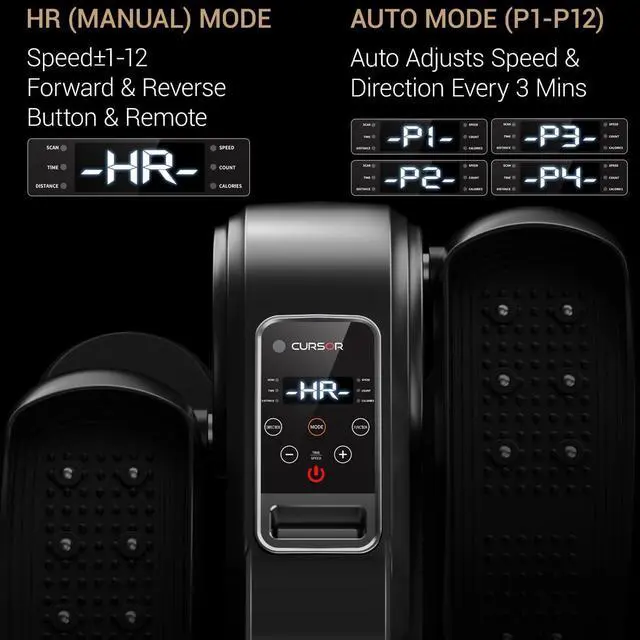 HR & Auto Mode: Exercise anytime, anywhere. In HR (Manual) mode, you can adjust workout time(15-30min), speed(1-12) and direction (forward&reverse) by remote control or button of the elliptical machine. Then switch " mode" to Auto mode that the speed and direction have been programmed. In auto mode, you can adjust P1-P12 mode by press mode button, the speed of the mini seated elliptical changes every minute, and the direction changes every 3 minutes
