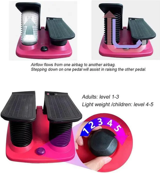 Before use, stepper exercise machine for women is always necessary to inflate the bellows. Push and gold in the resistance dial, located between the pedals, while gently pulling us on the pedals to fill the bellows, then release the dial. Pushing and holding in the dial will allow air to enter or exit the bellows system (depress and hold down the resistance dial to allow air to flow into the bellows)