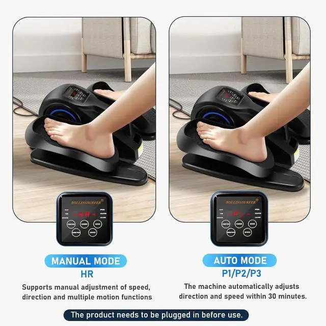 Auto & Manual ModesThe under desk elliptical offers 2 different modes depending on your needs. Auto (P1-P3) and Manual (5-levels speed, from 1.5KM /h to 5.7KM /h) for your choice. They are able to go either clockwise or counterclockwise as you want. No assembly required.