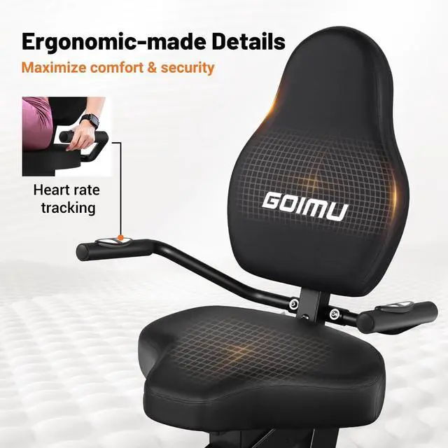 [Adjustable Seat & Spacious Design] Perfect for All Body Types. Designed with user comfort in mind, the Goimu Recumbent Bike features an adjustable seat that slides forward or backward to accommodate users of all heights. The spacious, ergonomic design provides ample legroom and back support, making it ideal for seniors or those with limited mobility. Whether you' re tall, short, or somewhere in between, this bike ensures a comfortable fit for everyone.