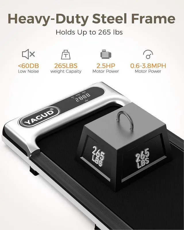 2.5HP Powerful Motor: The treadmill is equipped with a powerful 2.5HP motor and offers a large weight capacity of up to 265 lbs. And it is quiet while using. Using noise below 45 DB, so you can exercise while not disturbing others.