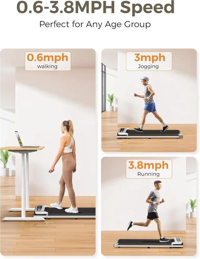 Treadmill: Our under desk walking pad is designed to walk, jog and run machine. You can adjust the speed from 0- 3.8 MPH according to your needs. It' s easy for you to keep exercising while working in the office.