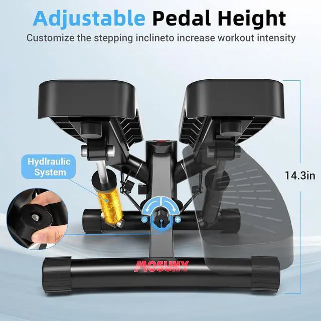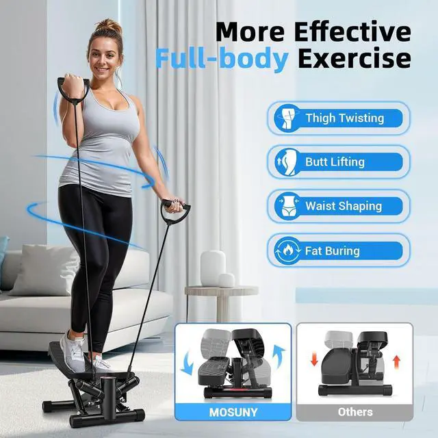 Full Body Workout: Compared to traditional steppers, the twisting motion of MOSUNY stair stepper with the resistance bands produces quite the workout. It provides a full-body workout, targeting not only your lower body but also engaging your arms, shoulders, and core. Whether you' re a beginner or a seasoned fitness enthusiast, this mini stepper is sure to help you reach new heights in your fitness journey.