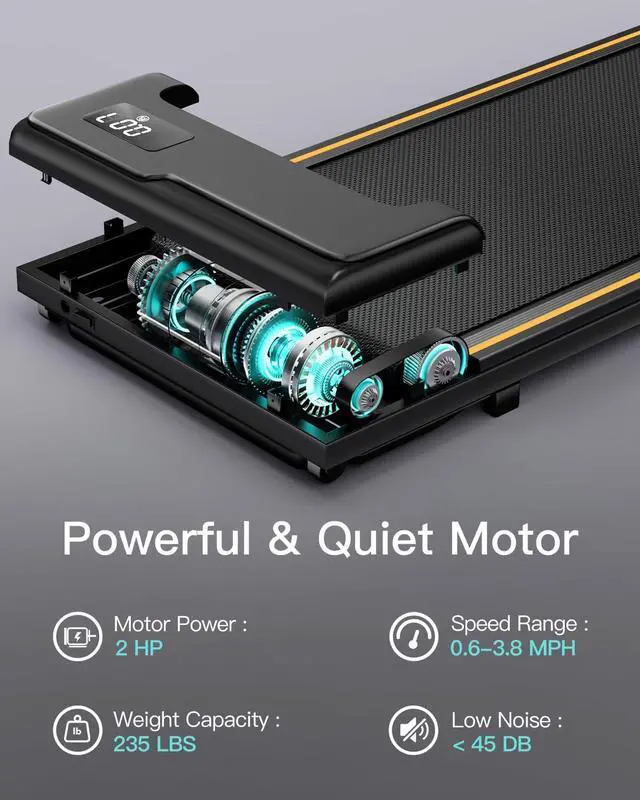 Powerful & Quiet Motor ~ The walking treadmill is equipped with a powerful motor capable of speeds ranging 0- 3.8MPH. The motor operates quietly, producing less than 45dB of sound, allowing for exercise at home or work without disturbing others