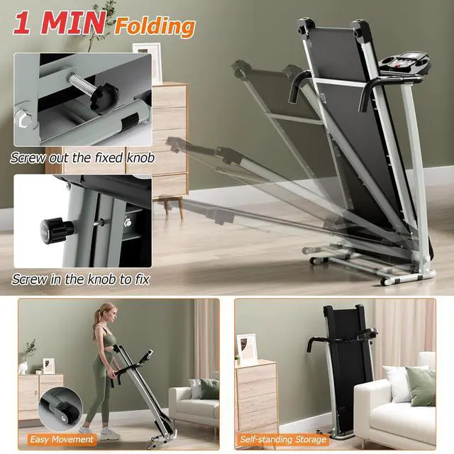 1 Min Folding & Easy Movement - The portable treadmill is easy to be folded with control knobs, bringing self-standing storage to save space. Additionally, the smooth wheels allow you to easily move the folding treadmill anywhere.