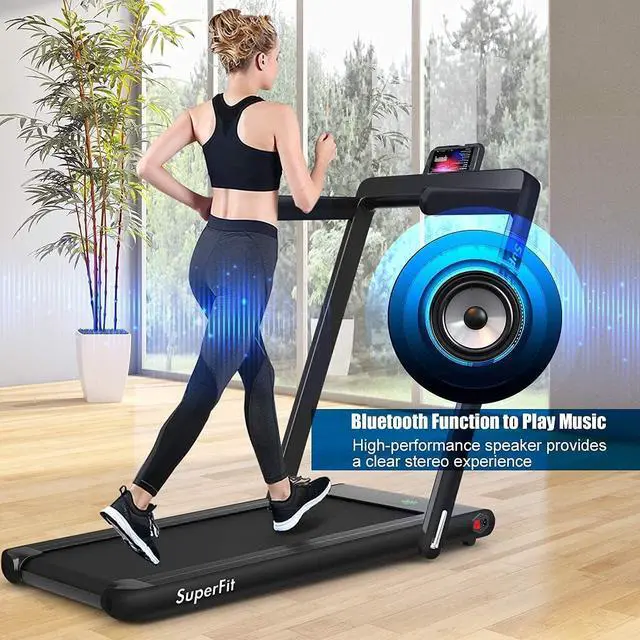 2 in 1 Running & Walking Treadmill GYMAX 2-in-1 treadmill offers you two modes of exercise. When you raise the riser up and install the armrests, you can shape your body with the maximum speed of 7.5MPH. When the riser is folded, you can put it under your table to enjoy walking at a speed of 0.6MPH -25MPH while working. Meanwhile, speed unit could be switched between mile and km in APP