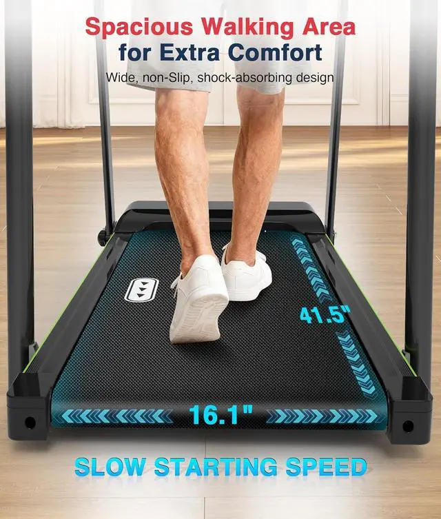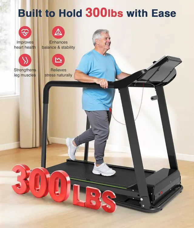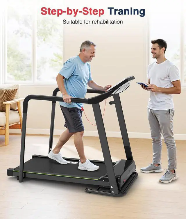 Great Father' s Day Gift This treadmill for seniors is designed with long handrails for added balance and support, making it ideal for older parents. Help your dad stay healthy and active without leaving home. The armrests can be removed for flexible use by other family members, and it folds easily for compact storage. With built-in transport wheels, this treadmill is perfect for home use and makes daily walking safe and convenient.