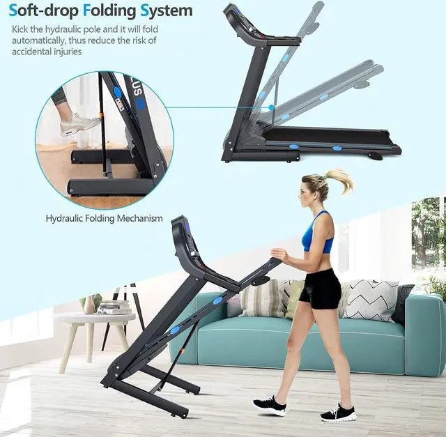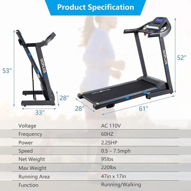 Large-Size Running Belt & High Power Motor The 47 x 17 5-layer running belt provides premium shock absorption, and avoids injury caused by stepping on two tracks nearby. At the same time, the 2.25HP powerful motor makes the treadmill run smoothly and steadily without noise, which is suitable for home and office.