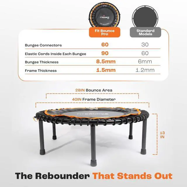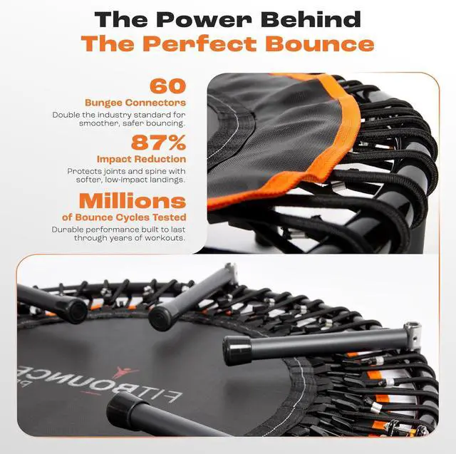 MINI TRAMPOLINE FOR ADULTS: Premium mega-strong bungee rebounder system with 60 connectors, twice as many as most rebounders, that ensures a gentle, joint-friendly bounce. Supports lymphatic drainage, muscle toning, and better posture for home workouts, rehab, and holistic fitness.