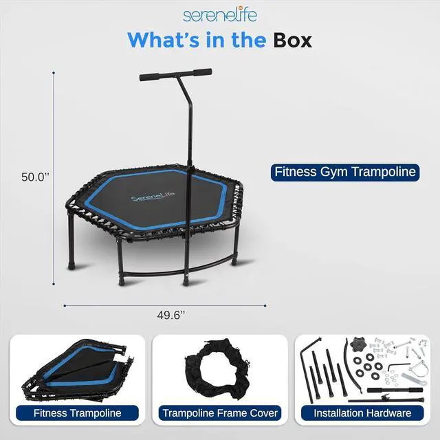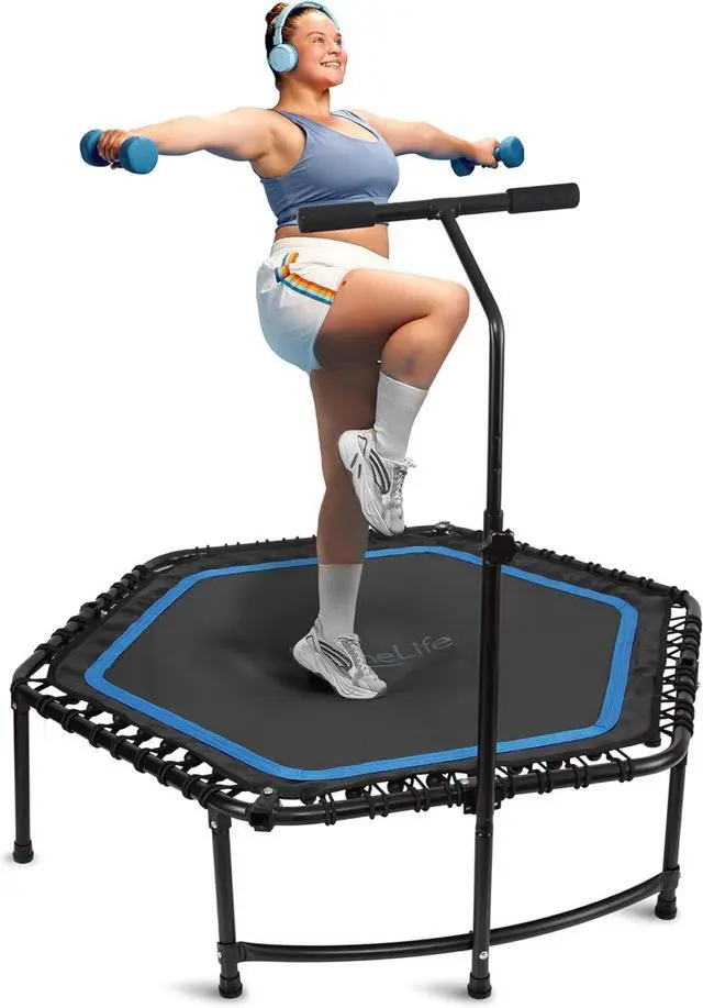 ADJUSTABLE HANDLEBAR: The mini trampoline for adults features a T- handle adjustable to 3 height levels ( 43.3 " 51" ), providing a comfortable grip and added stability for users of different ages and fitness levels.