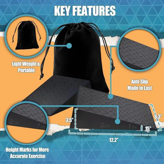 Essential Features: Made with a non-slip textured surface, the foot wedge ensures stability during heavy lifts. 2 Height Marks for more accurate workout. Its lightweight design allows for easy to carry, while its high weight capacity supports intense training sessions. Plus, it comes with a carry bag for convenience