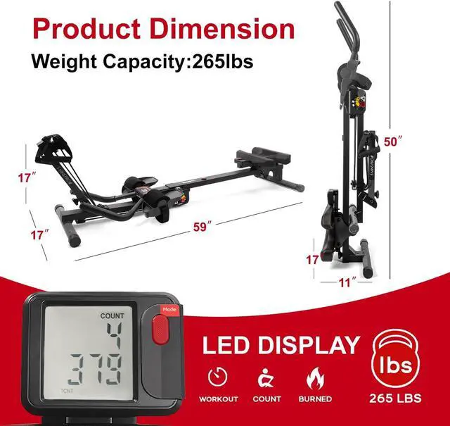 : This rowing machine is designed to support users weighing up to 265 pounds and with heights ranging from 5 feet to 6 feet 6 inches. It features a robust and reliable frame that ensures stability even during intense workouts.