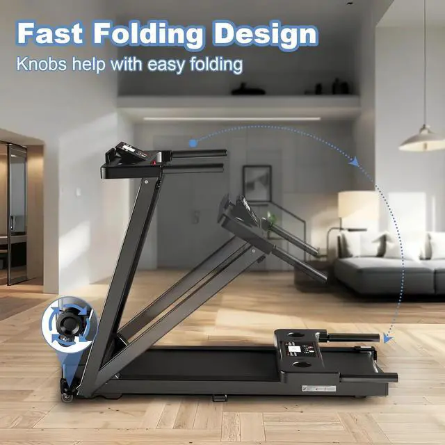 Juturna treadmills for home comes with knobs and mobility wheels for easy folding, moving and storage. Total dimensions when folded are only 48 L x 22 W x 5.5 H inches. The running belt is made of multi-layer non-slip textured material.