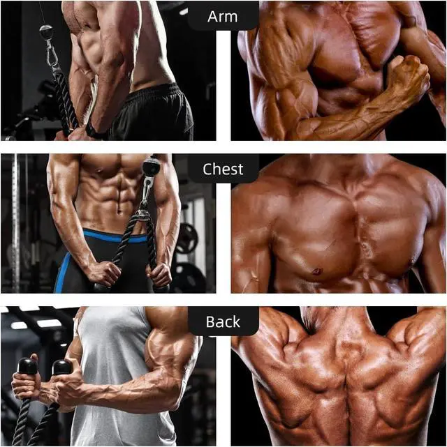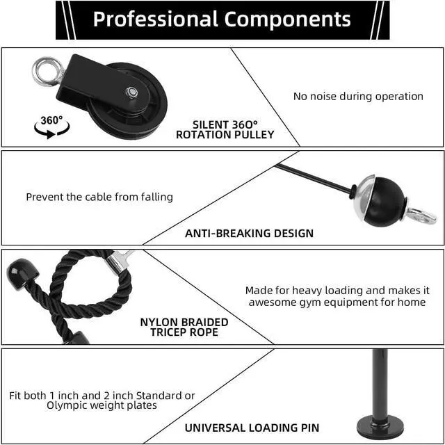 Professional Components & Stability: The upgraded loading pin is made of thicken steel, fitting both Olympic and Standard weight plates, and its load-bearing capacity of up to 220 pounds. 27in tricep rope is constructed from heavy-duty black nylon with durable rubber stoppers on both ends