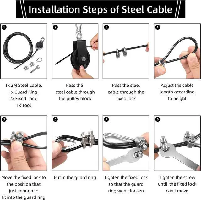 Package Included: 1x upgrade loading pin, 1x swivel pulley, 1x nylon tricep rope, 1x 2M adjustable steel cable, 1x cable loop, 2x security buckles, 1x tool, 1x hanging strap, 3x carabiners, providing you to get the short, high-intensity workouts like those you do in the gym