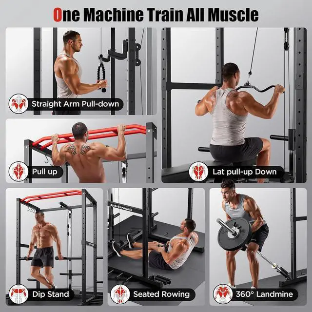 Train all your muscles with one machine- Sportsroyals power cage combines a squat rack, lat pull-down machine, power tower, dip bar, 14 height adjustable pillars, and other free Accessories. It can free a variety of exercises, for example, wide & narrow lat pull-downs, 360° landmine, seated cable rows, bench presses, squats, dead-lifts, triceps extensions, pull-ups, chin-ups, dips, and more. Train all your muscles with one machine.