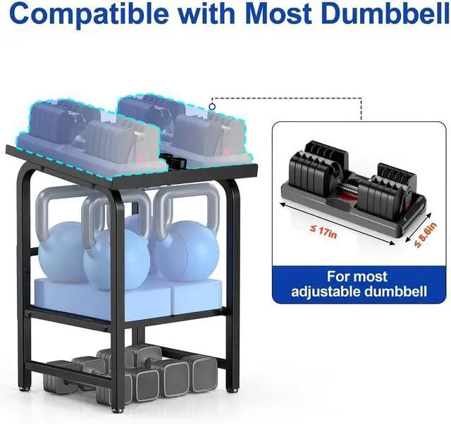 Fits for most adjustable dumbbells The top platform is designed to hold most adjustable dumbbells (17" long, 8.6 " wide), keeping your weights organized and easy to access.