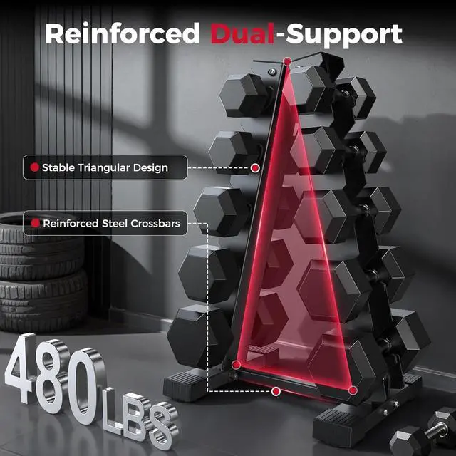 Maximum Capacity 480 LBSThis dumbbell rack uses a stable triangular design, which is made of commercial-grade steel and is at least 0.5 mm thicker than others. The base is fitted with non-slip foot covers, making it extremely stable and durable. It can hold up to 480 pounds and does not wobble when taking in or taking out dumbbells.