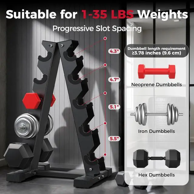 1-35 LBS Capacity Designed with progressive spacing, suitable for 1-30 lb dumbbells (neoprene dumbbells, hex dumbbells, etc. ). Flexible arrangements allow for various dumbbell combinations up to a maximum of 35 lbs.
