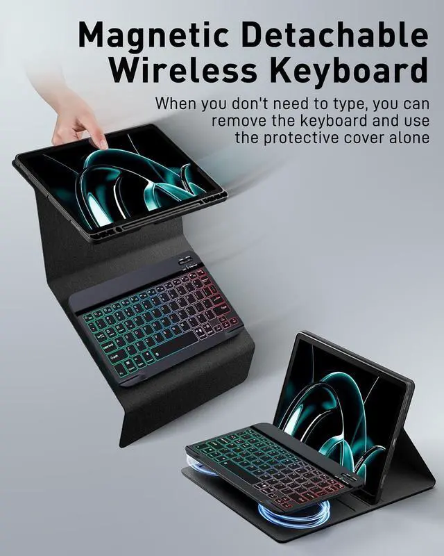 Mouse and magnetic detachable keyboardThe case comes with a rechargeable Bluetooth mouse and a magnetic detachable Bluetooth charging keyboard. This ultra-thin and lightweight magnetic keyboard firmly attaches to the case, helps the tablet stand upright, and turns it into a mini laptop in less than a second. You can move and adjust the position of the keyboard at any time according to your preference